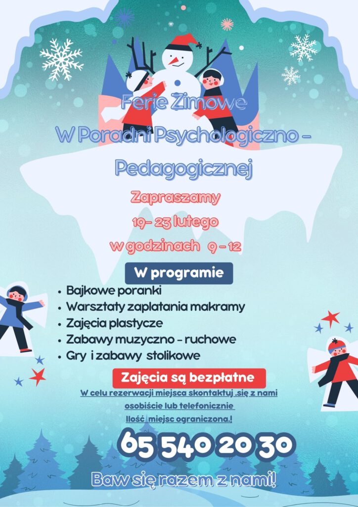 Zapraszamy na zajęcia feryjne do naszej Poradni. Zajęcia odbędą się w drugim tygodniu ferii od 19 – 23.02.2024 r. , w godzinach od 9.00 – 12.00. w Programie gry, zabawy manualne, ruchowe m.in. warsztaty zaplatania makramy, karaoke, bajkowe poranki i wiele innych atrakcji.