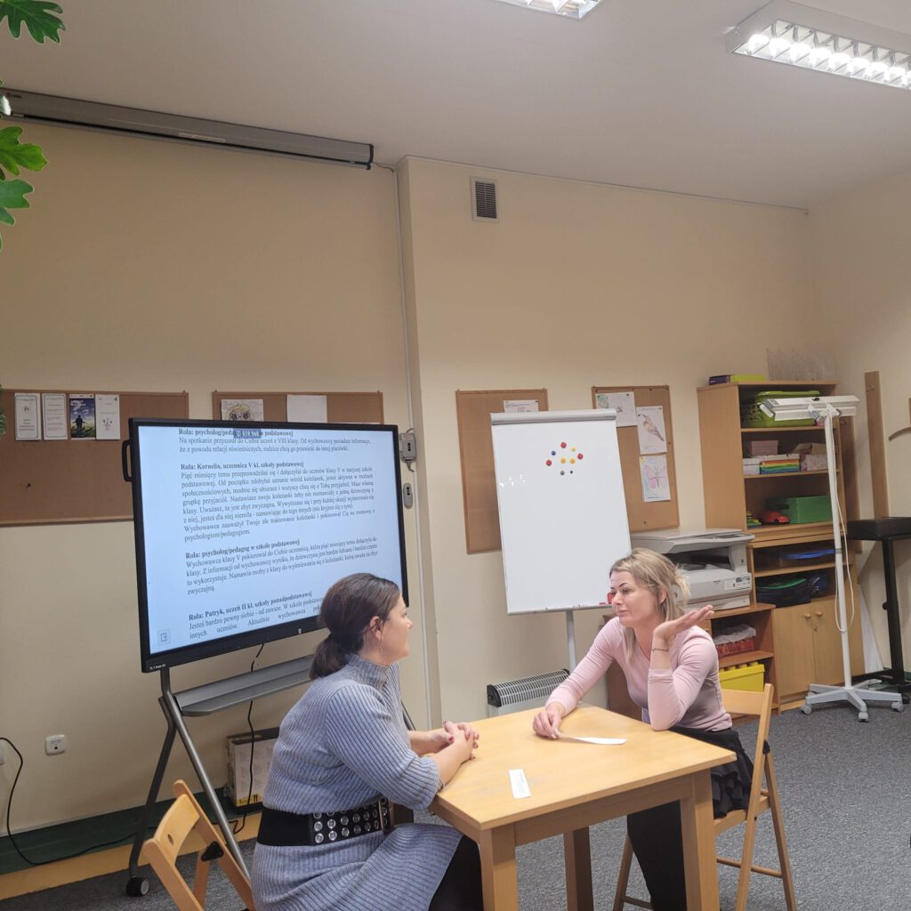 Podczas spotkania wyodrębniliśmy wymagające zachowania uczniów, z którymi psycholodzy i pedagodzy spotykają się na co dzień. Uczestnicy odgrywali także scenki, które pozwoliły im na chwilę stać się uczniem z trudnościami.