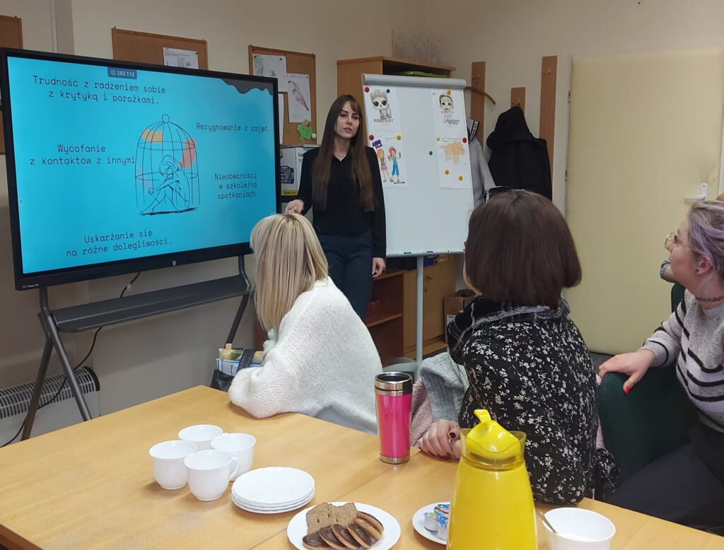 W tym dniu rozpoczęliśmy od mini wykładu przedstawiającego statystyki m.in. prób samobójczych i diagnoz depresji wśród dzieci i młodzieży, a także przykładowe niepokojące zachowania, które powinny zwrócić naszą uwagę.